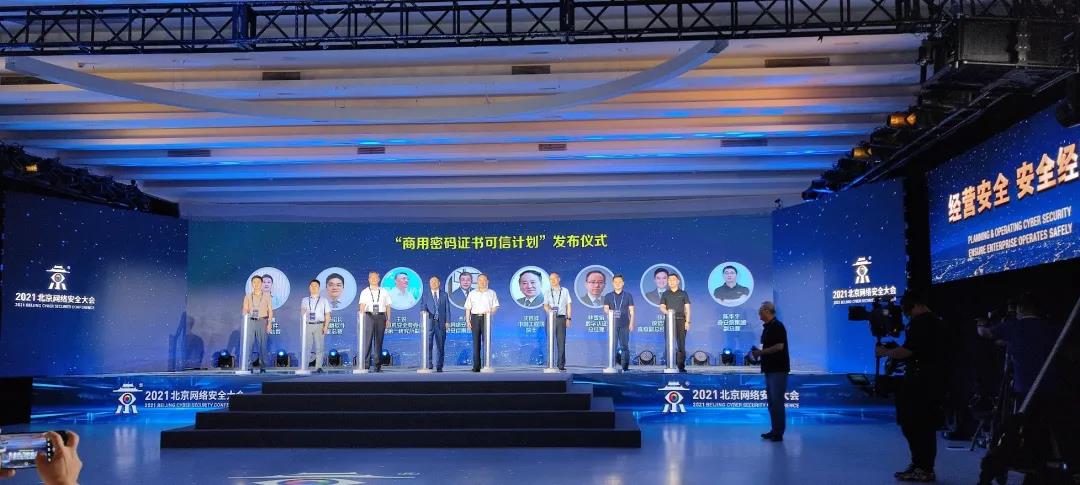 在现场“商用密码证书可信计划”发布环节,奇安信董事长齐向东邀请了于锐主任、沈昌祥院士、林雪焰等嘉宾一起参与发布仪式。