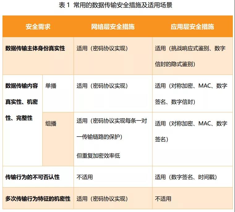 针对数据传输环节的主体身份真实性,传输数据内容的真实性、机密性和完整性,传输行为的不可否认性,以及多次传输行为特征的机密性等需求,网络层和应用层均存在几种常用的安全防护措施,各自适用于不同的应用场景,如下表所示。