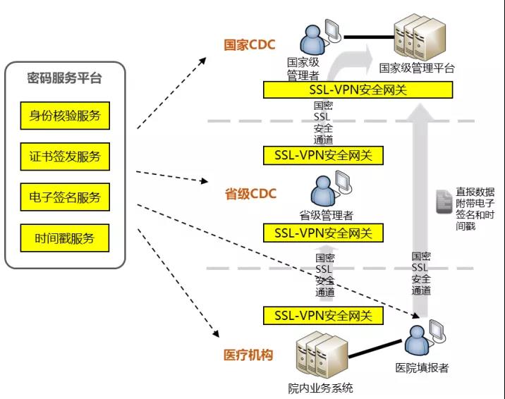为了解决上述数据传输安全需求,北京数字认证通过一体化密码服务构建了疾控数据报送安全体系,如下图所示。