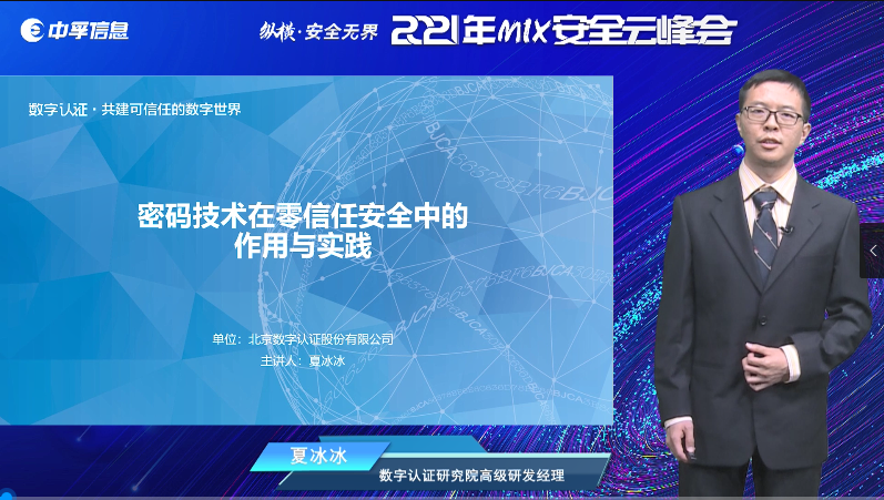本次大会以线上直播的方式,邀请中国科学院院士沈昌祥等业内大咖,围绕“纵横·安全无界”,探索网络安全的无限边界,激发数字经济活力,把握时代脉搏,解构未来的安全蓝图,筑牢数字安全屏障,共同为国家安全赋能启智。北京数字认证股份有限公司(以下简称“数字认证”)研究院高级研发经理夏冰冰博士受邀出席零信任专场会议,并发表“密码技术在零信任安全中的作用与实践”的主题演讲。