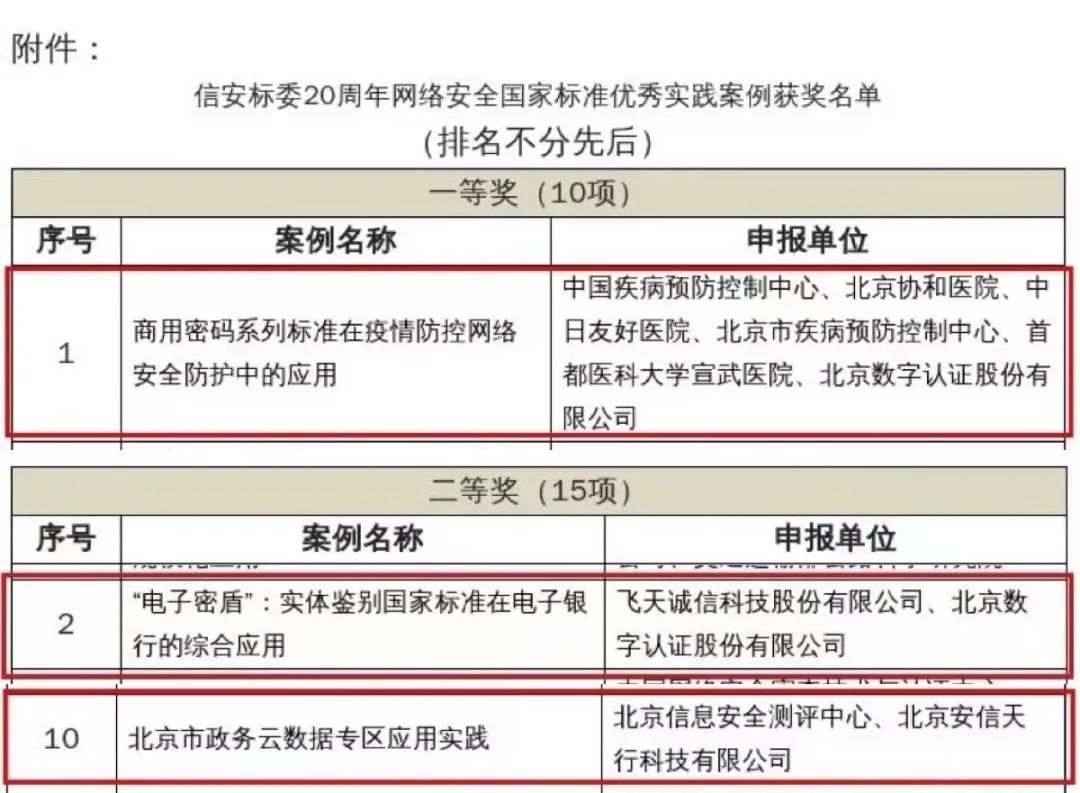 此次获一等奖的《商用密码系列标准在疫情防控网络安全防护中的应用》,是数字认证依托于30余项国家标准体系,帮助各级医疗机构建设密码保障系统,率先完成了基于密码技术的非接触式业务流程优化改造,有力保障了防疫和医疗业务的可信可靠开展;获二等奖的《“电子密盾”:实体鉴别国家标准在电子银行的综合应用》是数字认证将十余项标准深度应用于电子银行业务系统,创新实现了数字证书和动态口令相结合的安全机制,树立了国内电子银行安全管理新典范;获二等奖的《北京市政务云数据专区应用实践》,是数字认证将20余项网络安全国家标准应用于政务云数据专区的建设,全面落实了云计算和数据安全方面相关国家标准要求,成为全国电子政务安全监测工作的重要支点。