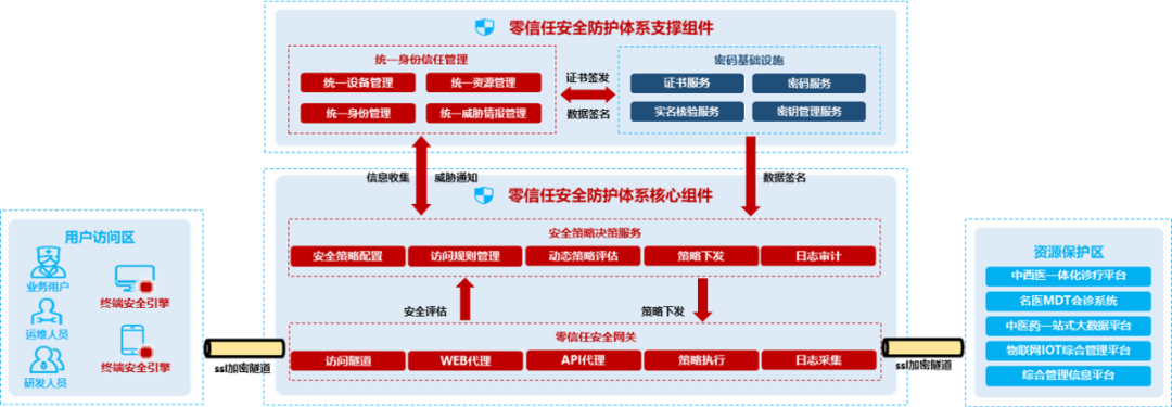 本次获奖应用案例是数字认证在对黄埔联创院的安全现状和需求进行深入分析后,基于零信任安全理念,充分发挥密码技术的作用,以“可信身份、可信设备、可信网络通信、可信应用、可信数据”为目标,构建的完整网络安全保障体系。该体系综合评估“用户+设备+应用”组合,建设了包含动态身份鉴别、细粒度访问控制、加密通信、电子签名、安全态势分析等在内的网络安全机制,充分满足了患者、专家从互联网接入参与多方会诊、远程复诊等业务流程的保护需求。