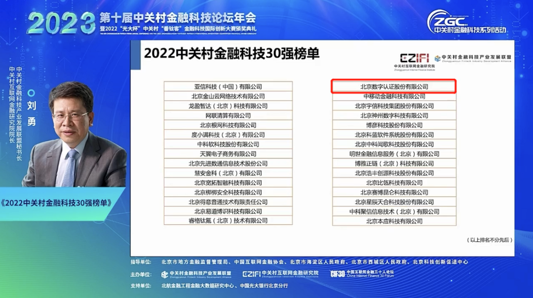 近日,中关村互联网金融研究院、中关村金融科技产业发展联盟联合公布“2022中关村金融科技30强榜单”,数字认证荣耀登榜。该评选活动于11月初正式启动,旨在借助企业发展能力、技术创新能力、融资能力、品牌影响力等构成的指标体系,并重点关注被评对象在金融科技核心技术突破、落地应用与标准研制情况,全面评估中关村金融科技企业综合实力,彰显北京金融科技的创新能力与活力。