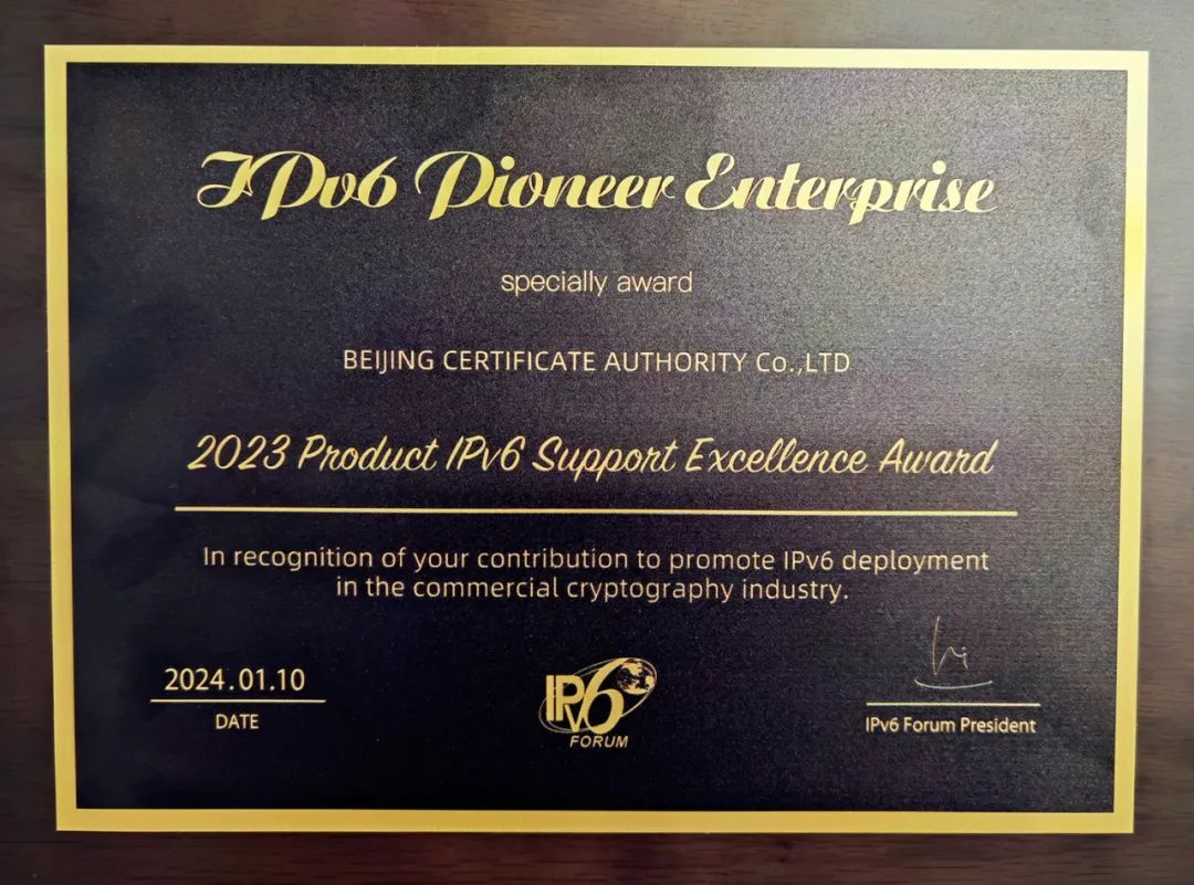 日前,全球IPv6论坛正式公布中国地区2023年度“IPv6 先锋企业”名单,北京数字认证股份有限公司荣获“IPv6先锋企业-IPv6支持度优秀奖”。