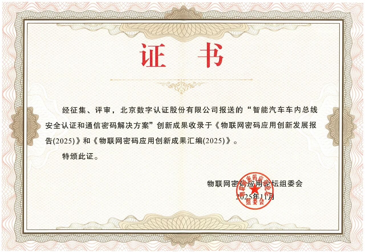 近日,在行业主管部门指导及中国密码学会等单位支持下,物联网密码应用论坛组委会正式发布“2025物联网密码应用创新成果”。数字认证牵头申报的智能汽车车内总线安全认证和通信密码解决方案,参与申报的基于国产密码的电力物联网全域安全保障关键技术与规模化应用成功入选创新成果名单。