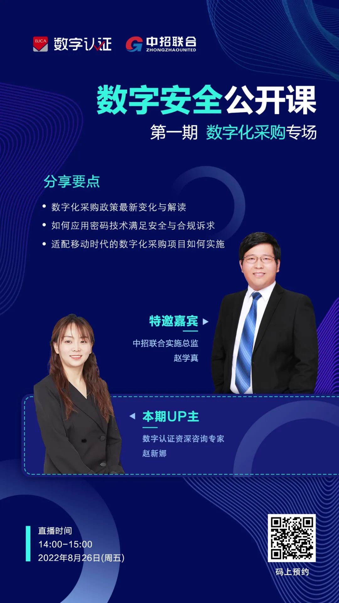 “数字安全公开课”是数字认证面向企业数字化转型中的安全需求、合规需求,打造的直播栏目,聚焦人力资源管理、电子招投标、供应链管理、财务管理、物流管理等具体场景,解读热点分析趋势、把脉需求分享实践,为企业全流程数字业务安全可信开展,做好数据安全工作建言献策。