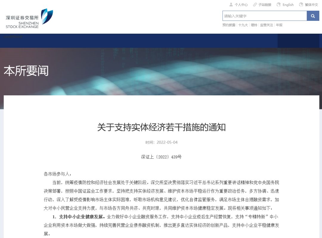当前,统筹疫情防控和经济社会发展处于关键阶段。为贯彻落实习近平总书记系列重要讲话精神和党中央国务院决策部署,按照中国证监会工作要求,坚持把支持实体经济发展、维护资本市场平稳运行作为重要政治任务,深入了解受疫情影响市场主体实际困难,满足市场主体合理融资需求,加大对中小民营企业支持力度,近日,深交所重磅发布《关于支持实体经济若干措施的通知》(以下简称“通知”),力推八条措施支持实体经济发展。