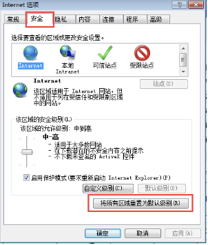 ④ 点击"安全"按钮,再点击"将所有区域重置为默认级别",如下图: